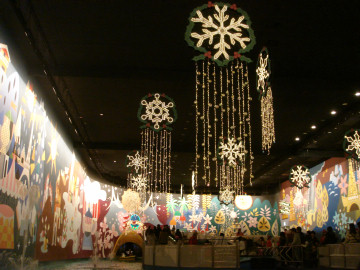 その後またまたポップコーンに並ぶ。今度はチョコレート味で、容器がクリスマスバージョンだ。並んでいるうちにやんやんは寝てしまった。重いな。 そうこうするうちに次のパレードがやってきたので、妻とコムスメはまた離脱してパレード見物。その後、やんやんも復活し、ポップコーンもなんとかGET。そしてファストパスで「イッツ・ア・スモール・ワールド」へ。世界中がクリスマス&お正月になっていて、なかなか楽しめた。