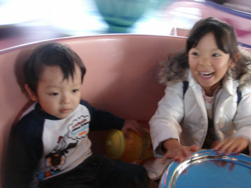 さて、無事ファストパスをGETして戻ろうとすると、「アリスのティーパーティー」の列が比較的空いているのを発見! 聞いてみると待ち時間25分くらいだという。パレードの時間で空いているらしい。すぐさま列に加わり、電話で連絡。パレード通過後に妻子がやってきて合流。いやはや、我ながらナイスなファインプレーだ。 家族4人でティーカップに乗ったのだが、コムスメはカップをがんがん回しまくる。こちとら写真を撮ろうとカメラを覗いているので、だんだん気持ち悪くなってくる。見ると、やんやんもふらふらしている。未体験ゾーンに突入の2歳児、大丈夫か?